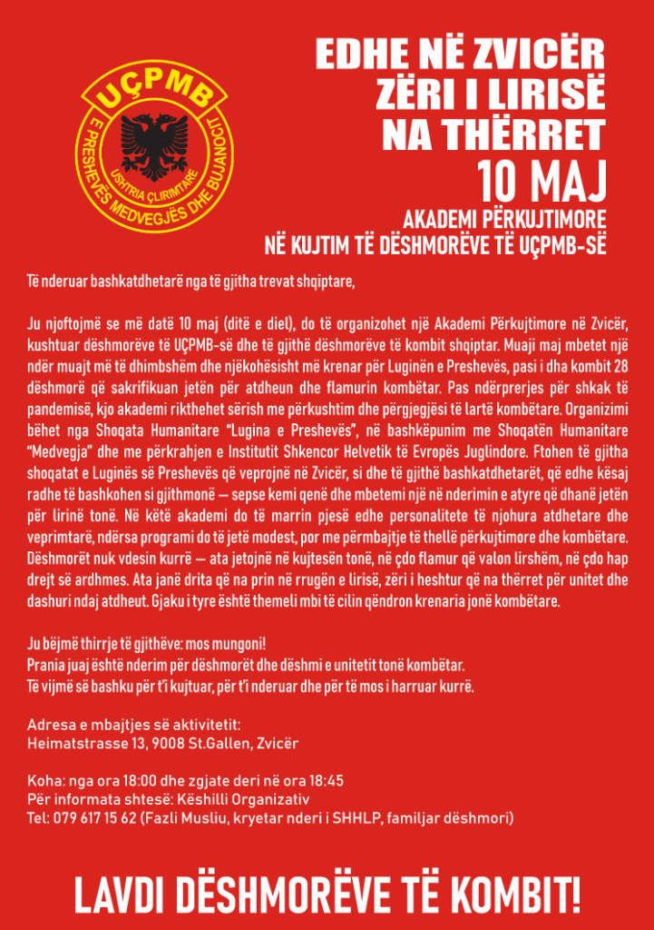Më 10 maj, në qytetin e St. Gallenit në Zvicër, do të mbahet një akademi përkujtimore në nderim të dëshmorëve të Ushtrisë Çlirimtare për Preshevë, Medvegjë dhe Bujanoc (UÇPMB) si dhe të gjithë dëshmorëve të kombit shqiptar.