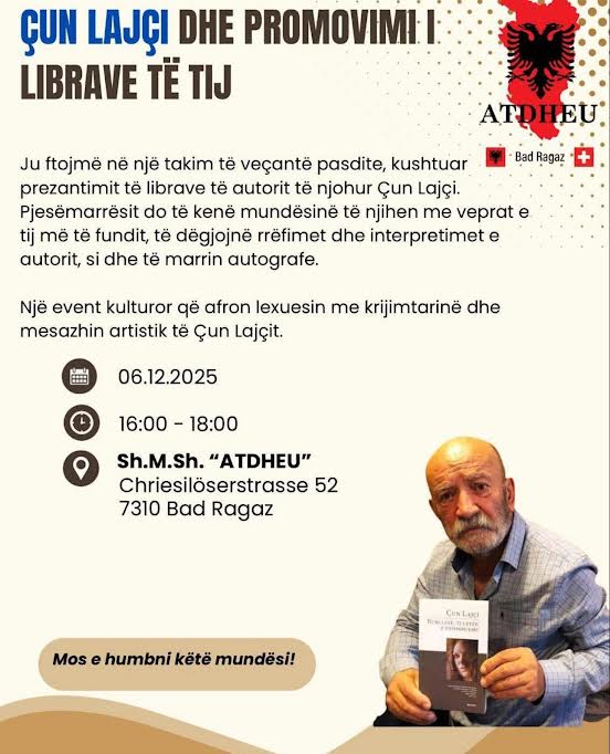 Në mbrëmjen e 6 dhjetorit 2025 ( E shtune), në ambientet e shoqatës kulturore “ATDHEU” në Bad Ragaz, do të zhvillohet një aktivitet i veçantë kulturor i dedikuar promovimit të librave të aktorit dhe autorit të njohur, Çun Lajçi. Ngjarja pritet të mbledhë dashamirës të artit dhe letërsisë, të cilët do të kenë mundësinë të njihen nga afër me krijimtarinë e tij më të fundit.