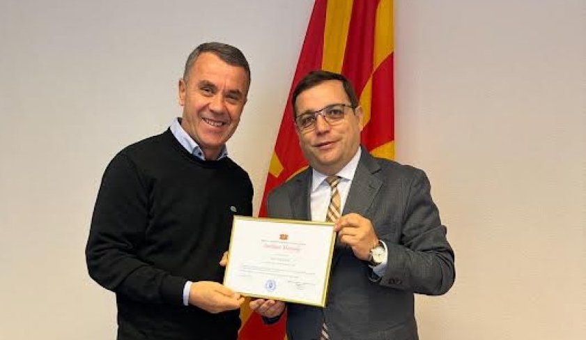 Në fund të takimit, pas një gote me ujë mikpritjeje dhe bisedave të përzemërta, Ambasadori Demiri ndau një mirënjohje të veçantë për Prof. Naser Ulajn, në shenjë vlerësimi për punën e tij shumëvjeçare në dobi të komunitetit dhe arsimit.