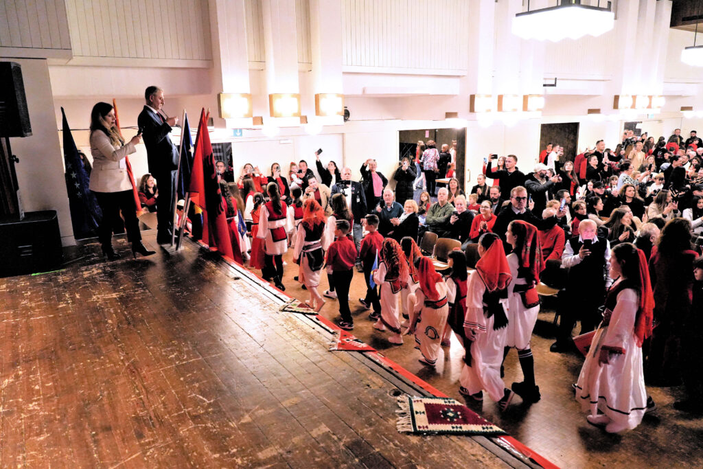 Manifestimi nisi me një moment që elektrizoi gjithë sallën. Fëmijët – e ardhmja e kombit larg vendit të të parëve – hynë të rreshtuar me veshje kombëtare, me flamuj të Shqipërisë dhe Kosovës në duar. Zërat e tyre e mbushën sallën me emocion, ndërsa prindërit nuk i fshehën dot lotët e gëzimit dhe krenarisë. Dukej sikur të gjithë ishim për një çast në Tiranë, Shkup apo në Prishtinë – e megjithatë më shumë se kaq, sepse rrallë herë edhe në atdhe mblidhen në një sofër kaq të madhe shqiptarë nga të gjitha trevat.