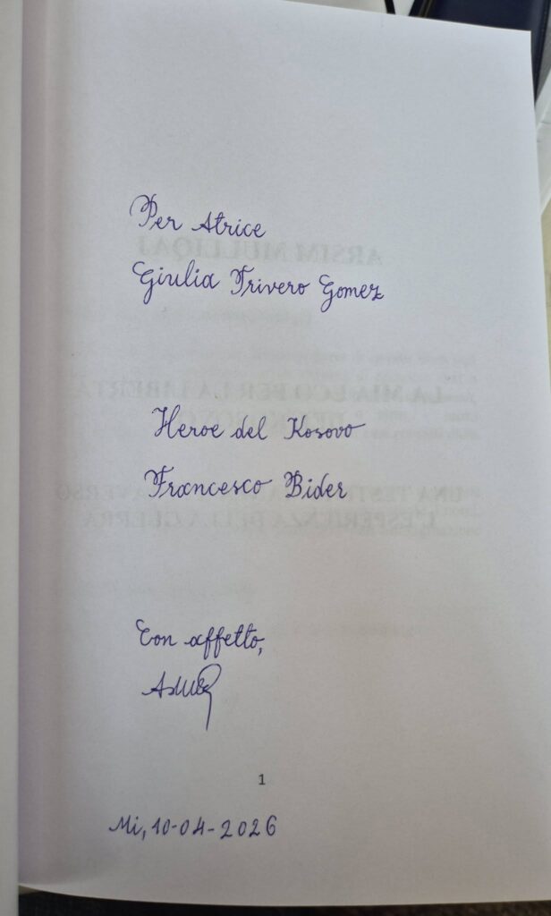 Libri mban titullin “La mia ecco per la libertà del Kosovo”, një vepër që përmbledh ndjenja, kujtime dhe reflektime mbi rrugëtimin e Kosovës drejt lirisë. Ky gjest, në dukje i thjeshtë, mbart një simbolikë të thellë: ai përfaqëson një urë lidhëse mes kujtesës historike dhe brezave të sotëm, mes sakrificës dhe mirënjohjes, mes kombësive që bashkohen përmes idealeve të përbashkëta. Në atë tavolinë, për pak çaste, u bashkuan historia, arti, dhimbja dhe krenaria.