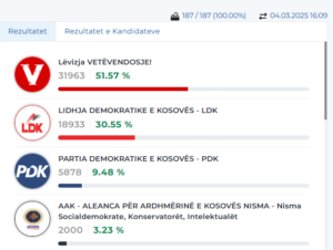 Sipas të dhënave të publikuara në faqen zyrtare të KQZ-së, nga numërimi i 187 kutive që ishin gjithsej, Lëvizja Vetëvendosje ka dalë e para me 31,963 vota, apo 51.57%. E dyta ka dalë Lidhja Demokratike e Kosovës me 18,933 vota, që i përgjigjet 30.55%. Partia Demokratike e Kosovës ka marrë 5,878 vota, apo 9.48%, ndërkaq, Aleanca për Ardhmërinë e Kosovës ka marrë 2,000 vota, apo 3.23%.
