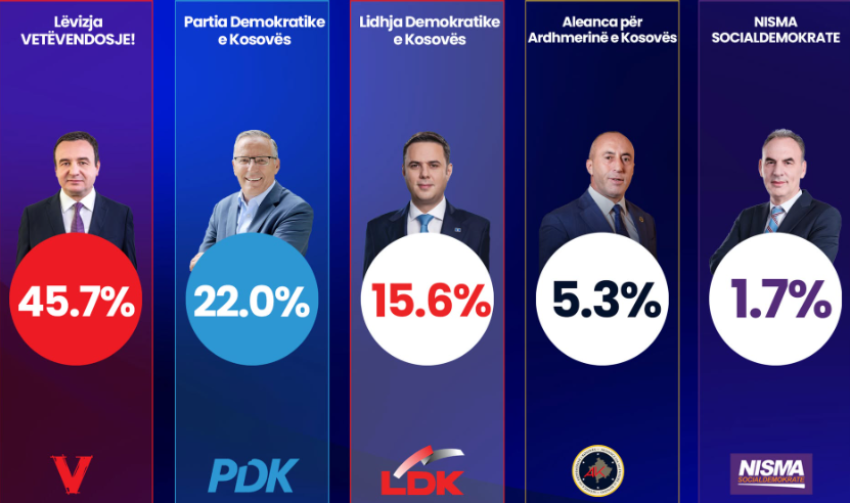 Sipas të dhënave të fundit të publikuara nga UBO Consulting në bashkëpunim RTV Dukagjinime, rezultatet e Exit Poll‑it tregojnë se Lëvizja Vetëvendosje (LVV) prinë me rreth 45.7% të votave, duke u renditur e para në zgjedhjet e sotme parlamentare në Kosovë.