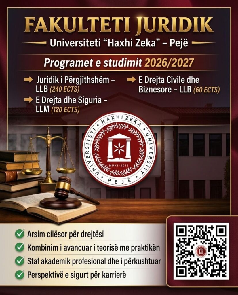 Fakulteti Juridik ofron studime cilësore dhe programe moderne, të dizajnuara sipas standardeve bashkëkohore të arsimit të lartë. Mësimi zhvillohet në një ambient akademik serioz, me staf të kualifikuar dhe të përkushtuar ndaj suksesit të studentëve.