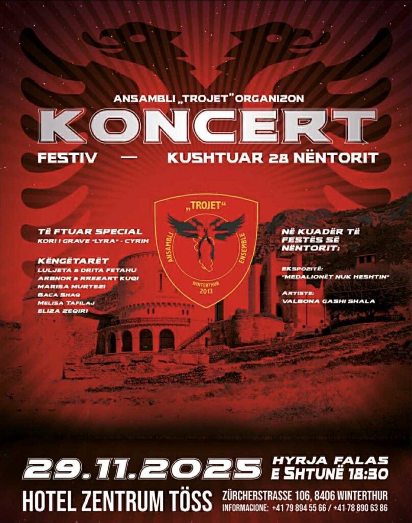 Ju mirëpresim me respekt që ta festojmë së bashku këtë ditë të rëndësishme, me këngë, valle dhe art që na bashkon, njoftoj Ansambli Trojet. Sponsor medial HelveticALforum.ch
