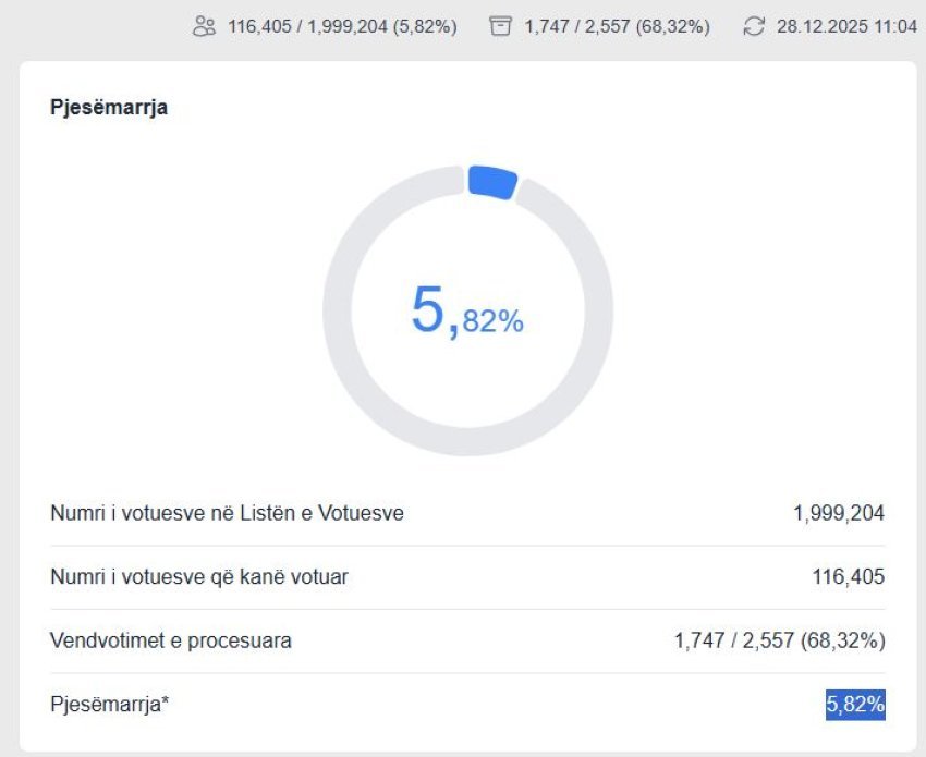 Qytetarët e Kosovës sot po ushtrojnë të drejtën e votimit. Komisioni Qendror i Zgjedhjeve ka filluar publikimin e statistikave mbi pjesëmarrjen e votuesve në zgjedhjet e parakohshme për Kuvendin e Republikës së Kosovës. Sipas të dhënave të fundit, deri në orën 11:00, në Republiken e Kosovës kanë votuar 116 mijë e 405 votues nga 1 milionë e 999 mijë e 204 persona që kanë të drejtë vote. Sipas të dhënave, deri më tani kanë votuar 116 mijë e 405 qytetarë, apo 5.82%. /BS