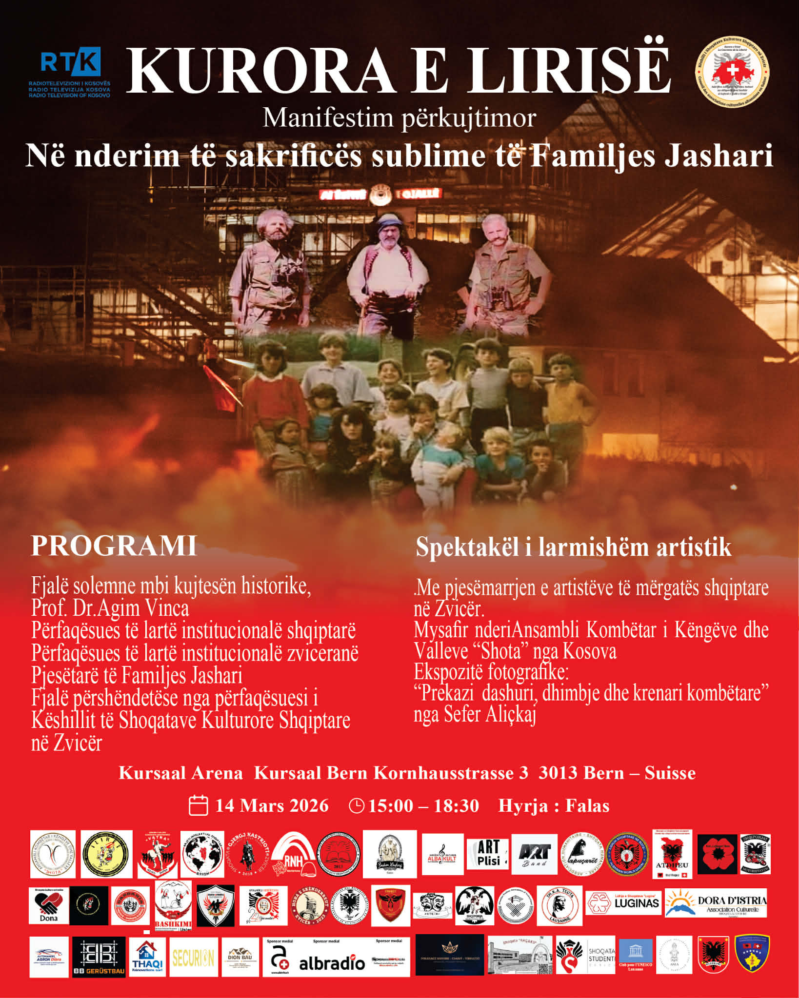 Në nderim të sakrificës sublime të Familjes Jashari, organizohet manifestimi përkujtimor “Kurora e Lirisë”, një aktivitet solemn dhe artistik që bashkon komunitetin shqiptar në Zvicër.