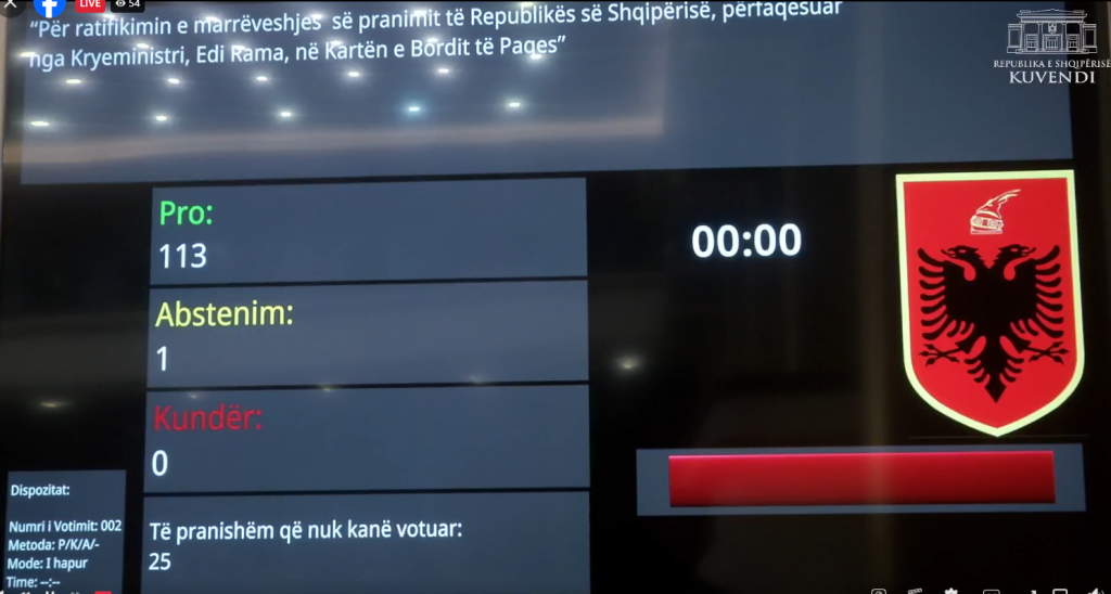 Parlamenti shqiptar miratoi këtë të enjte me 110 vota pro, 0 kunder dhe 0 abstenim ratifikimin e marrëveshjes së pranimit të Republikës së Shqipërisë, e përfaqësuar nga kryeministri Rama, në Bordin e Paqes.