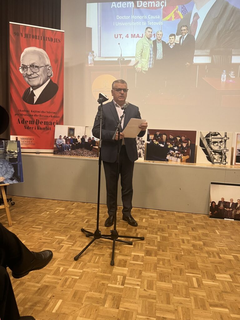 Pastaj, moderatori e thirri në bien Kryetarin e Shoqërisë «Lëvizja», i cili në emër të Shoqërisë «Lëvizja» dhe ne e tij personal përshëndeti dhe të ju uroj mirsëardhe në ditëlindjen e 90-të në përjetësi të A. Demaçit, për njeriun që tërë jetën zgjuarsinë e Tij e vuri në shërbim të kombit duke u bërë shtylla kurrizore e Lëvizjes Kombëtare. Për Adem Demaçin që kurrë nuk rrahu gjokse se, unë ja solla lirinë. Për Adem Demaçin që frymëzoi Adem Jasharin me shok, i cili me luftën e tij mbinjerëzore e vulosi fitoren e Kosovës. Për Adem Demaçin që Profesor Dr. B. Kosumi do të shkruan: “Nëse Lirinë e Kosovës mund ta paramendojmë si një pemë të madhe e të lulëzuar, të jeni të bindur se rrënjët e saj janë te HASAN PRISHTINA me shokë, lulet e saja të çelura janë ADEM JASHARI me shokë, ndërsa trungu i sajë është ADEM DEMAÇ me shokë”.