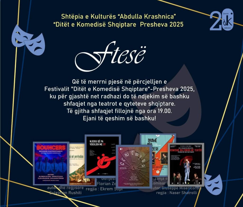 Ka nisur edicioni i 20-të, jubilar, i manifestimit kulturor “Ditët e Komedisë Shqiptare”, një ngjarje tashmë tradicionale që prej dy dekadash është shndërruar në simbol të jetës kulturore të Preshevës dhe mbarë Luginës. Ky edicion do të zgjasë gjashtë net radhazi, duke sjellë në skenë shfaqje komedie nga teatro të njohura shqiptare.