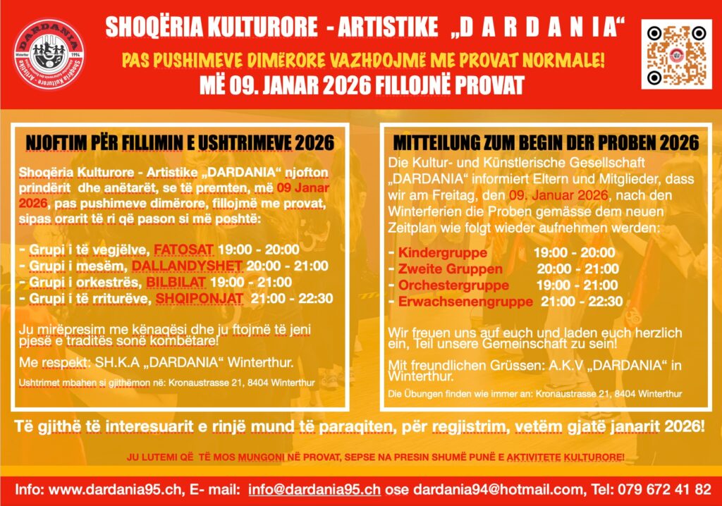 Siç ka mësuar helveticALforum.ch, më 09 janar 2026 SHKA Dardania fillon zyrtarisht provat normale, duke hapur një kapitull të ri aktivitetesh kulturore dhe artistike për këtë vit. Këto prova do të zhvillohen sipas programit të zakonshëm dhe do të shoqërohen me mundësinë e regjistrimit të anëtarëve të rinj. Gjatë muajit janar 2026, shoqata do të organizojë gjithashtu edhe një audicion për zbulimin e talenteve të reja, në fusha të ndryshme artistike, duke u dhënë hapësirë fëmijëve, të rinjve dhe të gjithë të interesuarve që dëshirojnë të kontribuojnë dhe të zhvillojnë aftësitë e tyre në art dhe kulturë, transmeton helveticALforum.ch.