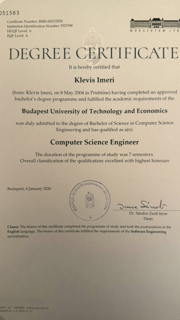 Klevis Imeri ka përmbyllur me sukses të shkëlqyeshëm studimet në drejtimin Inxhinieri e Shkencave Kompjuterike (Computer Science Engineer) në Budapest University of Technology and Economics, duke u vlerësuar me titullin “Excellent with Highest Honours” – me nderime të larta. Ky sukses nuk është vetëm një arritje personale, por një moment krenarie për familjen, për Luginën e Preshevës dhe për gjithë kombin shqiptar.
