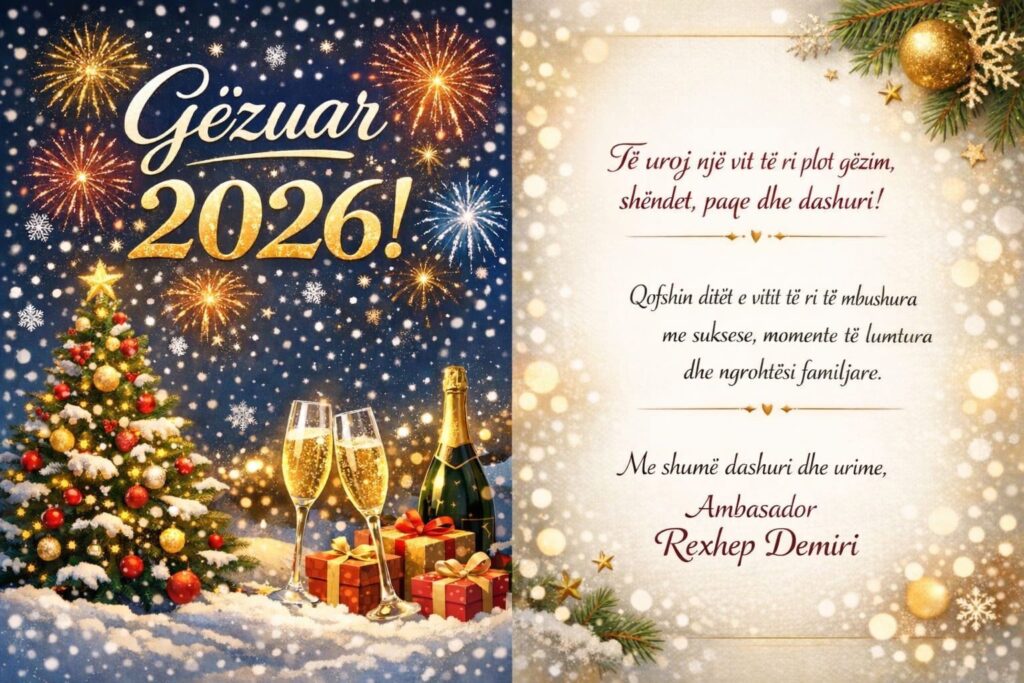 Në prag të Vitit të Ri 2026, me ndjenja të veçanta respekti dhe mirënjohjeje, dëshiroj t’ju drejtohem me urimet më të përzemërta të gjithë miqve, shokëve, familjarëve, partnerëve tanë afaristë, institucioneve, shoqatave dhe çdo bashkëpunëtori që, me përkushtim dhe besim, na mbështet në misionin tonë diplomatik.