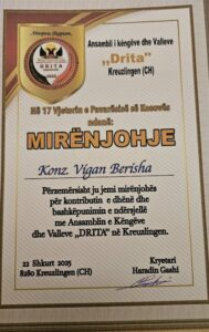 Brenda një viti sa është duke e drejtuar Konsullatën e Kosovës në Cyrih, z.Berisha me modestinë, sinqeritetin dhe përkushtimin e madh që e ka ndaj detyrës dhe mirënjohjes të kontributit të mërgimtarëve tanë për çlirim dhe pavarësi të Kosovës, po mundohet ti nderoj edhe në organizimet e tyre gjithandej Zvicrës. Ansambli „Drita“ në këtë përvjetor i ndajti mirënjohje, z.Berisha për përkrahjen që i ka bërë dhe që po i bënë jo vetëm Ansamblit „Drita“, por në përgjithësi mërgatës sonë.
