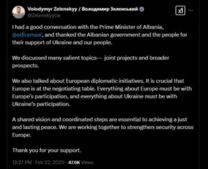 Në një postim në rrjetin social X, Zelensky e vlerësoi angazhimin e Shqipërisë në iniciativat diplomatike evropiane duke theksuar se është thelbësore që Evropa të jetë e angazhuar në proceset e bisedimeve dhe vendimmarrjeve lidhur me Ukrainën. Kjo deklaratë vjen në një kohë kur SHBA dhe Rusia kanë nisur diskutimet për arritjen e paqes në Ukrainë, por presidenti Trump ka përjashtuar nga këto bisedime BE-në dhe Kievin Zyrtar.